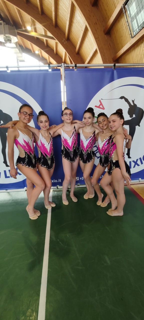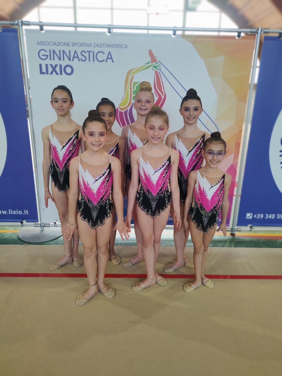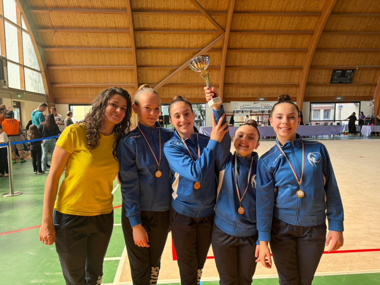 Nella categoria LB Allieve arriva un bellissimo e meritato terzo posto, ottenuto con un coinvolgente esercizio dalla squadra composta da Emma Sidoti, Giorgia Borroni, Zoe Mingardo e Maya Tamagni. Terzo posto anche nella coppia al cerchio, composta da Emma e Giorgia.