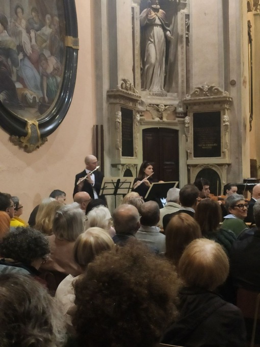 Il concerto – che ha registrato il tutto esaurito, costringendo parte del pubblico a tornare a casa in attesa della prossima replica – si è aperto con un omaggio extra- programma ad Alessandro Scarlatti nel 300° anniversario della morte. La Sinfonia n.1 in Fa maggiore, raffinato esempio del barocco italiano per 2 flauti e orchestra che ha anticipato l’eleganza classica dei brani successivi, ha visto come solisti Pierangelo Prandoni e Maria Barattiero. Il m° Marco Raimondi ha quindi introdotto il tema del concerto, il contrastato rapporto tra Antonio Salieri e Wolfgang Amadeus Mozart, entrambi attivi presso la corte di Vienna nella seconda metà del 1700 e la musica ha confermato la qualità artistica dell’evento con l’esecuzione del Concerto in Sol maggiore Ang 656 di Antonio Salieri, autore di cui quest’anno ricorre il 200° anniversario della morte e finora ingiustamente oscurato dalla leggenda che lo contrappose a Mozart, ma in realtà musicista di grande talento e influenza nel panorama viennese del Settecento.